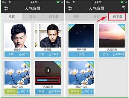 2)點(diǎn)擊下載后就會(huì)開(kāi)始下載這個(gè)背景圖,最后點(diǎn)擊【已下載】便能查看到你剛下載的天氣背景了。(如下圖)