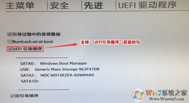 6、進(jìn)入后將UEFI順序前面的勾去掉,讓機(jī)器默認(rèn)為傳統(tǒng)啟動(dòng),這樣方便安裝WIN7,如下圖所示;