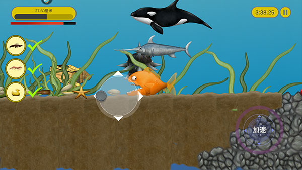 3、玩家通過滑動(dòng)屏幕控制小魚的移動(dòng),小魚只能吃比自己小的東西。注意是“東西”,不是“食物”,所以只要是比自身個(gè)頭小的物體,小到小石塊,大到大輪船、戰(zhàn)斗機(jī),只要條件允許都能一吞而盡。甚至還能跳上岸去將陸地上的房屋,甚至燈塔裝進(jìn)肚子里,區(qū)區(qū)人類更是不用說了。不過要注意的是如果比自己體型大的物體有攻擊性,就要多加小心了,因?yàn)椴粌H是你家小魚肚子會(huì)餓。例如正在獵食的鯊魚或大胃王鯨魚,到了后期因?yàn)樾◆~變成“水怪”,人類也會(huì)派出艦艇或者魚雷來進(jìn)行攻擊。