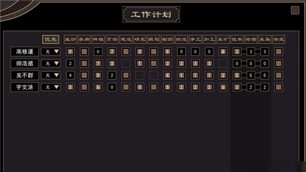 亮著的格子點一下就會變成黑色,黑色意味著這個人不會去干這件事情,同樣的,亮著的就意味著這個人會去干這件事,如果你需要一個人去狩獵,那么你點亮狩獵就可以了,因為點數(shù)高的人效率更高,那么我們就應(yīng)該盡量讓點數(shù)高的人去干你希望干的事情,比如四個人物烹飪分別為7 3 2 0,那么7和3的人物烹飪更快也更容易成功,可是因為7是主人物,經(jīng)常會出門,所以我讓7 3都亮著,讓2 0變成黑色。經(jīng)常干一件事情的人相應(yīng)的技藝點數(shù)會增加,比如你經(jīng)常采礦,那你的采礦技藝就會一直緩慢增加,所以不要吝嗇機會去培養(yǎng)你需要的人才。最前面一欄是優(yōu)先,就是這個人物會專注于做的事情,一般來說所有人都會默認優(yōu)先建造,如果你某個人物專注于干一件事情,比如伐木,那么你只需要優(yōu)先伐木,這樣就不會出現(xiàn)他突然跑去加工木板的情況了。